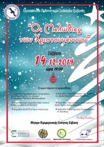 Η Ομοσπονδία Πολιτιστικών Συλλόγων Ευβοίας σας προσκαλεί το Σάββατο 14 Δεκεμβρίου 2019 και ώρα 19:00 στη Χορωδιακή Χριστουγεννιάτικη Εκδήλωση “Οι μελωδίες των Χριστουγέννων”, στο Μέγαρο Περιφερειακής Ενότητας Ευβοίας. Συμμετέχουν: – Χορωδία Παραδοσιακού Τραγουδιού της Ιερά Μητροπόλεως Χαλκίδος – Χορωδία Παραδοσιακού Τραγουδιού του Εργαστηρίου Πολιτισμού Νέας Αρτάκης “Παναγία Φανερωμένη” – Παραδοσιακή Χορωδία Πολιτιστικού Συλλόγου Δοκού “Η […]