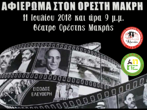 Η θεατρική ομάδα του Συλλόγου Εργαζομένων του Νοσοκομείου Χαλκίδας σε συνεργασία με τον Σύλλογο «το Αλωνάκι» και με την υποστήριξη του Οργανισμού Πολιτισμού του Δήμου Χαλκιδέων (Δ.Ο.Α.Π.Π.Ε.Χ.), παρουσιάζουν θεατρική παράσταση αφιερωμένη στον μεγάλο ηθοποιό Ορέστη Μακρή, που θα πραγματοποιηθεί την Τετάρτη 11 Ιουλίου 2018 και ώρα 21:00 στο Θέατρο Ορέστης Μακρής. Είσοδος ελεύθερη