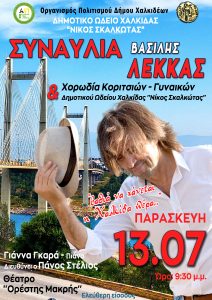 Παρασκευή 13 Ιουλίου 2018, Θέατρο Ορέστη Μακρής, ώρα 21:30 Με τίτλο «Βαθιά να χάνεται η Χαλκίδα πέρα», ο Οργανισμός πολιτισμού του Δήμου Χαλκιδέων (ΔΟΑΠΠΕΧ), διοργανώνει τη συναυλία του Δημοτικού Ωδείου «Ν. Σκαλκώτα», με τον εξαίρετο Έλληνα ερμηνευτή, ΒΑΣΙΛΗ ΛΕΚΚΑ. Διευθύνει: Ο Πάνος Στέλιος Συμμετέχουν: Γιάννα Γκαρά – Πιάνο και η Χορωδία Κοριτσιών-Γυναικών του Ωδείου Είσοδος […]