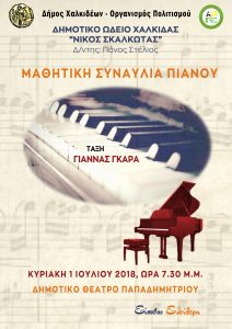 Ο Δημοτικός Οργανισμός Άθλησης Πολιτισμού & Περιβάλλοντος Χαλκίδας (Δ.Ο.Α.Π.Π.Ε.Χ.). και το Δημοτικό Ωδείο «Ν. Σκαλκώτα», διοργανώνουν «Μαθητική Συναυλία Πιάνου», με την τάξη της καθηγήτριας του Ωδείου, Γιάννας Γκαρά. Η Συναυλία θα πραγματοποιηθεί Κυριακή 1 Ιουλίου 2018 και ώρα 19:30, στο Δημοτικό Θέατρο Παπαδημητρίου. Η είσοδος για το κοινό είναι ελεύθερη.
