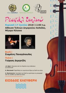 Ο Δ.Ο.Α.Π.ΠΕ.Χ., ο Δήμος Χαλκιδέων και το Εργαστήρι Καλλιτεχνικής Παιδείας πραγματοποιούν ένα ιδιαίτερο καλλιτεχνικό γεγονός στη Χαλκίδα, την Κυριακή 17 Ιουνίου στις 11:00 π.μ., στην αίθουσα τελετών του Δημαρχείου Χαλκίδας, (Μέγαρο Κότσικα). Ο διεθνούς φήμης βιολονίστας, Γιώργος Δεμερτζής, θα συνοδεύσει στο πιάνο τον μαθητή του Σταμάτη Παναγόπουλο, σε ένα ρεσιτάλ βιολιού, όπου θα παρουσιαστούν τα […]