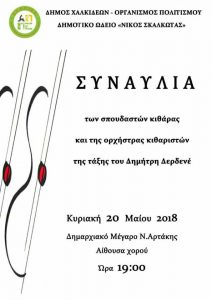 Συναυλία των σπουδαστών κιθάρας και της ορχήστρας κιθαριστών της τάξης, του Δημήτρη Δερδενέ, διοργανώνει το Δημοτικό Ωδείο Χαλκίδας ”Νίκος Σκαλκώτας”, την Κυριακή 20 Μαΐου και ώρα 7.00μ.μ. στο Δημαρχιακό Μέγαρο Ν. Αρτάκης-αίθουσα χορού, με ελεύθερη είσοδο για το κοινό.
