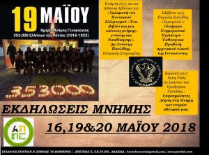 Ο Σύλλογος Ποντίων N. Εύβοιας ” ΟΙ ΚΟΜΝΗΝΟΙ ” συνεχίζοντας τον πολυετή αγώνα του Ποντιακού Ελληνισμού για τη διεθνή αναγνώριση της Γενοκτονίας των Ελλήνων του Πόντου σας προσκαλεί να δώσετε το παρόν στις 3ήμερες δράσεις που διοργανώνει. Τετάρτη 16 Μαΐου 2018 – 20:00- Δημοτική Αίθουσα, Αβάντων 50 : -“Χαλαμονή του ποντιακού ελληνισμού: Ένα βιβλίο και […]