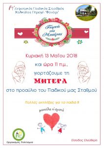 Ο Α’ Δημοτικός Παιδικός Σταθμός Χαλκίδας, με την υποστήριξη του Δ.Ο.Α.Π.Π.Ε.Χ., διοργανώνει εκδήλωση για την Γιορτή της Μητέρας, την Κυριακή 13 Μαΐου 2018 και ώρα 11.00 π.μ., στο προαύλιο του παιδικού σταθμού στην περιοχή “Φανάρι”.