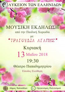 Η Παιδική Χορωδία του Λυκείου Ελληνίδων της Χαλκίδας θα παρουσιάσει την εκδήλωση με θέμα “Τραγούδια της Αγάπης”. Η παράσταση θα δοθεί στο θέατρο Παπαδημητρίου την Κυριακή 13 Μαΐου 2018 στις 19.30.