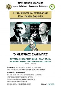Ο Δήμος Χαλκιδέων, ο ΔΟΑΠΠΕΧ και ο Πολιτιστικός Σύλλογος των Φίλων του Γιάννη Σκαρίμπα, σας προσκαλούν στο «Ετήσιο Φιλολογικό Μνημόσυνο στον Γιάννη Σκαρίμπα», που θα πραγματοποιηθεί τη Δευτέρα 19 Μαρτίου 2018 και ώρα 7 μ. μ., στο Δημοτικό Θέατρο Παπαδημητρίου και περιλαμβάνει: Ι. Ομιλία για τον θεατρικό κόσμο του Γιάννη Σκαρίμπα, από το Φιλόλογο – […]