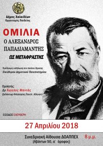 Ο Αλέξανδρος Παπαδιαμάντης ως μεταφραστής. Ομιλία στο πλαίσιο ίδρυσης του Ελεύθερου Δημοτικού Πανεπιστημίου. Παρασκευή 27.4.2018 και ώρα 8.00 μ.μ., στην συνεδριακή αίθουσα του Δ.Ο.Α.Π.Π.Ε.Χ. (Αβάντων 50, α’ όροφος). Το θέμα θα αναπτυχθεί από τον Δρ. Άγγελο Μαντά, Διδάκτορα Φιλολογίας του Πανεπιστημίου Αθηνών.