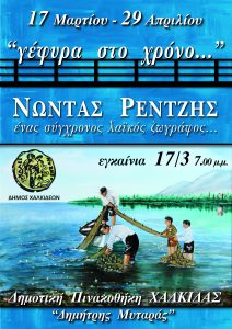 Ο Δήμος Χαλκιδέων και ο Δημοτικός Οργανισμός Πολιτισμού (ΔΟΑΠΠΕΧ), εγκαινιάζουν την έκθεση του Λαϊκού Ζωγράφου Νώντα Ρέντζη “Γέφυρα στον χρόνο”, το Σάββατο 17 Μαρτίου 2018 και ώρα 19:00μμ, στη Δημοτική Πινακοθήκη Χαλκίδας “Δημήτρης Μυταράς”. Η έκθεση αποτελεί μια εικαστική γέφυρα ανάμεσα στο παρελθόν και το παρόν, με έργα ζωγραφικής που φιλοδοξούν να κεντρίσουν τη συλλογική […]