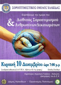 Ο Σοροπτιμιστικός Όμιλος Χαλκίδα με την υποστήριξη του Οργανισμού Πολιτισμού του Δήμου Χαλκιδέων διοργανώνει εκδήλωση για τον Διεθνή Σοροπτιμισμό και τα Ανθρώπινα Δικαιώματα, την Κυριακή 10 Δεκεμβρίου και ώρα 7 το απόγευμα στην αίθουσα συνεδριάσεων του ΔΟΑΠΠΕΧ (Αβάντων 50). Ομιλήτρια, η Αγγελική Γαλάνη – Χαλιώτη, δικηγόρος. Είσοδος ελεύθερη