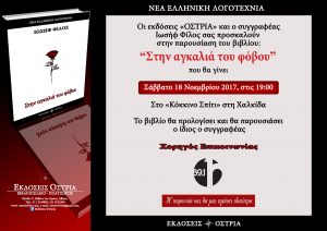 Οι εκδόσεις “ΟΣΤΡΙΑ” και ο συγγραφέας Ιωσήφ Φίλος με την υποστήριξη του ΔΟΑΠΠΕΧ, πραγματοποιούν την παρουσίαση του βιβλίου του, “Στην Αγκαλιά του Φόβου”, το Σάββατο 18 Νοεμβρίου, και ώρα 19.00 στο Κόκκινο Σπίτι Χαλκίδας. Το βιβλίο θα προλογίσει και θα παρουσιάσει ο ίδιος ο συγγραφέας, Ιωσήφ Φίλος.