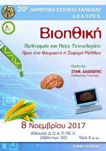 Το 20ο Δημοτικό Σχολείο Χαλκίδας με την υποστήριξη του Οργανισμού Πολιτισμού Δήμου Χαλκίδας διοργανώνει εκδήλωση – ομιλία, την Τετάρτη 8 Νοεμβρίου, και ώρα 6 το απόγευμα, στην αίθουσα του ΔΟΑΠΠΕΧ, Αβάντων 50, στον 1ο όροφο, με θέμα “Βιοηθική, Πολιτισμός και Νέες Τεχνολογίες: προς ένα θαυμαστό ή ζοφερό μέλλον;”. Ομιλητής, ο Σταμάτης Αλαχιώτης, καθηγητής Γενετικής. Είσοδος […]
