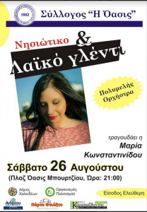 Ο σύλλογος «Η Όασις», με τη συμπαράσταση του Οργανισμού Πολιτισμού του Δήμου Χαλκιδέων, διοργανώνει την ετήσια εκδήλωσή του, με Νησιώτικο – Λαϊκό μουσικό πρόγραμμα, με τη Μαρία Κωνσταντινίδου στο τραγούδι, συνοδεία πολυμελούς ορχήστρας. Η εκδήλωση θα γίνει το Σάββατο 26 Αυγούστου 2017 και ώρα 21:00, στην πλαζ Όασις Μπουρτζίου, με είσοδο ελεύθερη για το κοινό.