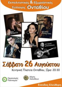 Ο Οργανισμός Πολιτισμού του Δήμου Χαλκιδέων και ο Εκπολιτιστικός – Εξωρ/κος Σύλλογος «Ονταθίου», συνδιοργανώνουν ΜΟΥΣΙΚΟΧΟΡΕΥΤΙΚΗ ΒΡΑΔΙΑ, που θα γίνει το Σάββατο 26 Αυγούστου 2017 και ώρα 21:00, στην κεντρική πλατεία του Ονταθίου Χαλκίδας. Συμμετέχουν οι μουσικοί: Αντώνης Δρακωνάκης (μπουζούκι), Μάνος Κοντραφούρης (βιολί), Βέρα Γκούμα (τραγούδι) και Λευτέρης Κατσαντώνης (κιθάρα-τραγούδι) Είσοδος ελεύθερη