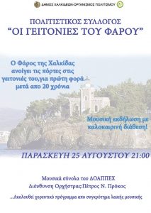 Ο Οργανισμός Πολιτισμού του Δήμου Χαλκιδέων και ο Εκπολιτιστικός Σύλλογος «Οι Γειτονιές του Φάρου», συνδιοργανώνουν μια όμορφη ΜΟΥΣΙΚΗ ΒΡΑΔΙΑ, για την Παρασκευή 25 Αυγούστου 2017 και ώρα 21:00, στο Φάρο Κακοκεφαλής, στο Πάρκο Σμηναγού Στρατάκια. Μετά από 20 χρόνια, το πάρκο ανοίγει τις πύλες του για να υποδεχθεί τα Μουσικά Σύνολα του ΔΟΑΠΠΕΧ, υπό τη […]