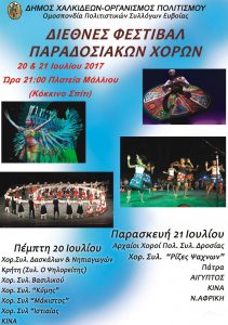 Το Διεθνές Φεστιβάλ Παραδοσιακών Χορών, που διοργανώνει ο Οργανισμός Πολιτισμού του Δήμου Χαλκιδέων, σε συνεργασία με την Ομοσπονδία Πολιτιστικών Συλλόγων Εύβοιας, θα πραγματοποιηθεί στη Χαλκίδα την Πέμπτη 20 και Παρασκευή 21 Ιουλίου 2017 και ώρα 21.00, στην πλατεία Μάλλιου (Κόκκινο Σπίτι). Το πρόγραμμα με τις Χώρες και τους Πολιτιστικούς Συλλόγους από την Ελλάδα και το […]