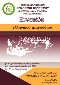 Ο Δημοτικός Οργανισμός Άθλησης, Πολιτισμού και Περιβάλλοντος Χαλκίδας σας προσκαλεί στη “Συναυλία Ελληνικού Τραγουδιού” που διοργανώνει το Δημοτικό Ωδείο Χαλκίδας, υπό τη διεύθυνση του Πάνου Στέλιου. Την Τετάρτη 5 Ιουλίου 2017 και ώρα 21.00, στο Θέατρο Ορέστης Μακρής. Είσοδος ελεύθερη. Συμμετέχουν: η Χορωδία κοριτσιών – γυναικών και το οργανικό σύνολο του Δημοτικού Ωδείου Χαλκίδας. Επίσης […]