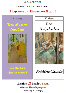 Η Δημοτική Σχολή Χορού σας προσκαλεί, τη Δευτέρα 26 Ιουνίου και ώρα 8 μ.μ. στο Θέατρο Παπαδημητρίου, στη δεύτερη κατά σειρά εκδήλωση της, στην παράσταση κλασικού χορού στην οποία λαμβάνουν μέρος τα εφηβικά και παιδικά τμήματα καθώς και τα τμήματα προετοιμασίας μπαλλέτου της Σχολής. Η παράσταση χωρίζεται σε δυο μέρη, στο μεν πρώτο μέρος που […]