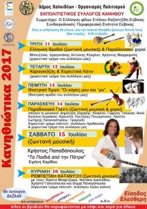 Ο Εκπολιτιστικός Σύλλογος Κανήθου με την υποστήριξη του ΔΟΑΠΠΕΧ πραγματοποιεί 6ήμερο εκδηλώσεων “Κανηθιώτικα 2017”. Όλες οι εκδηλώσεις θα πραγματοποιηθούν στη νέα πλατεία Κανήθου “Σμηναγού Παντελή Γκέλη”. Ώρα έναρξης: 21.00. Είσοδος ελεύθερη. Το πρόγραμμα των Κανηθιώτικων έχει ως εξής: Τρίτη 11 Ιουλίου, Ελληνική βραδιά με ζωντανή μουσική και παραδοσιακούς χορούς Τετάρτη 12 Ιουλίου, Θέατρο Σκιών Καραγκιόζη […]