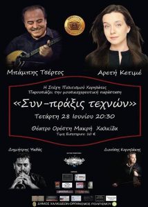 Η Στέγη Πολιτισμού “Χορηλάτες” διοργανώνει μουσικοχορευτική παράσταση “Συν- Πράξις Τεχνών”, την Τετάρτη 28 Ιουνίου 2017 και ώρα 20.30, στο Θέατρο Ορέστη Μακρή. Συμμετέχουν: Μπάμπης Τσέρτος, με την κομπανία του Αρετή Κετιμέ, φωνή Δημήτρης Ψαθάς, με την ζυγιά του Διονύσης Κορνιλάκης, με την λύρα του. Μετά το πέρας της μουσικοχορευτικής εκδήλωσης, θα ακολουθήσει συναυλία. Περισσότερες πληροφορίες […]