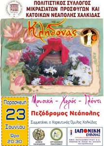 Γιορτή του Κλήδονα, με μουσική, χορό και γλέντι, διοργανώνει ο Πολιτιστικός Σύλλογος Μικρασιατών Προσφύγων και Κατοίκων Νεάπολης Χαλκίδας, την Παρασκευή 23 Ιουνίου 2017 και ώρα 20.30, στον Πεζόδρομο Νεάπολης. Συμμετέχει ο Χορευτικός Όμιλος Χαλκίδας. Με την υποστήριξη του Δημοτικού Οργανισμού Άθλησης Πολιτισμού Περιβάλλοντος Χαλκίδας.