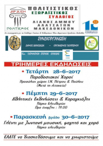 Ο πολιτιστικός Σύλλογος Λιανής Άμμου – Αλατσάτων – Μακεδονικών, συνδιοργανώνει με το Δήμο Χαλκιδέων και τον Οργανισμό Πολιτισμού Χαλκίδας (ΔΟΑΠΠΕΧ), 3ήμερο πολιτιστικών-αθλητικών εκδηλώσεων στις 28, 29 & 30 Ιουνίου. Συγκεκριμένα το πρόγραμμα έχει ως εξής: Τετάρτη 28/6 – Παραδοσιακοί Χοροί & τραγούδια (με το πέρας λιτάνευσης της ιεράς εικόνας) προαύλιος χώρος Ι.Ν. Πέτρου & Παύλου. […]