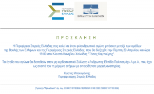 Φιλανθρωπικός Αγώνας Μπάσκετ θα πραγματοποιηθεί μεταξύ των ομάδων της Βουλής των Ελλήνων και της Περιφέρειας Στ.Ελλάδας, την Πέμπτη 20 Απριλίου 2017 και ώρα 19.00, στο Κλειστό Γυμναστήριο Κανήθου. Τα έσοδα του αγώνα θα διατεθούν στον μη κερδοσκοπικό Σύλλογο “Άνθρωπος – Ελπίδα – Πολιτισμός” Α.με.Α, που έχει σκοπό την μέριμνα των ατόμων με οποιαδήποτε μορφή αναπηρίας.