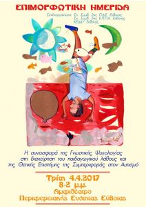 Επιμορφωτική ημερίδα με θέμα: “Η συνεισφορά της Γνωστικής Ψυχολογίας στη διαχείριση του Παιδαγωγικού λάθους και της θετικής επιστήμης της συμπεριφοράς στον Αυτισμό” θα πραγματοποιηθεί την Τρίτη 4 Απριλίου 2017, απο τις 8.00 έως τις 14.00 το μεσημέρι, στο Αμφιθέατρο της Π.Ε. Εύβοιας. Συνδιοργάνωση: Σχ.Συμβ. 2ης Π.Δ.Ε. Εύβοιας Σχ.Συμβ. 5ης Ε.Π.Π.Α. Εύβοιας ΚΕΔΔΥ Εύβοιας