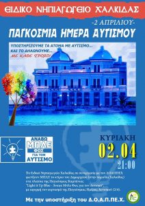 Ανάβω Μπλε φως για τον Αυτισμό! Κυριακή 2 Απριλίου (Παγκόσμια Ημέρα για τον Αυτισμό), στις 21.00 το βράδυ. Το Ειδικό Νηπιαγωγείο Χαλκίδας σε συνεργασία με τον ΔΟΑΠΠΕΧ, φωτίζουν Μπλε το κτίριο του Δημαρχείου στην παραλία, στα πλαίσια της Παγκόσμιας Καμπάνιας “Light it Up Blue” – Άναψε μπλε φως για τον αυτισμό, την Κυριακή 2/4, στις […]