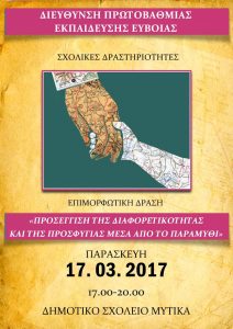 Επιμορφωτική δράση με τίτλο «»Προσέγγιση της διαφορετικότητας και της προσφυγιάς μέσα απο το παραμύθι», διοργανώνει η Διεύθυνση Πρωτοβάθμιας Εκπαίδευσης Εύβοιας, την Παρασκευή 17 Μαρτίου 2017, 17.00 – 20.00, στο Δημοτικό Σχολείο Μύτικα.