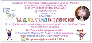Με αφορμή την Παγκόσμια Ημέρα Συνδρόμου Down (21 Μαρτίου), το Ειδικό Νηπιαγωγείο Χαλκίδας διοργανώνει, με την υποστήριξη του ΔΟΑΠΠΕΧ, ειδική ενημερωτική εκδήλωση κατά την οποία θα προβληθεί ταινία μικρού μήκους και videos σχετικά με το Σύνδρομο Down. Η εκδήλωση θα πραγματοποιηθεί τη Δευτέρα 20 Μαρτίου 2017 και ώρα 18.30 στην αίθουσα ΔΟΑΠΠΕΧ, Αβάντων 50. Είσοδος […]