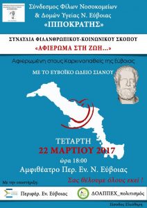 Στα πλαίσια της προσπάθειας του Συνδέσμου Φίλων Νοσοκομείων και Δομών Υγείας Εύβοιας “Ο Ιπποκράτης”, για τη δημιουργία Ογκολογικής Μονάδας στο Νοσοκομείο Χαλκίδας, θα πραγματοποιηθεί συναυλία του Ευβοϊκού Ωδείου, με τίτλο “Αφιέρωμα στη Ζωή…”, την Τετάρτη 22 Μαρτίου 2017 και ώρα 18.00, στο Αμφιθέατρο της Π.Ε. Εύβοιας. Η παρουσία σας είναι καθοριστική για το φιλανθρωπικό – […]