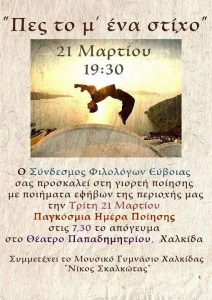 Ο σύνδεσμος Φιλολόγων Εύβοιας σας προσκαλεί στη γιορτή της ποίησης με ποιήματα εφήβων, την Τρίτη 21 Μαρτίου 2017, Παγκόσμια Ημέρα Ποίησης, και ώρα 7.30 το απόγευμα, στο Θέατρο Παπαδημητρίου. Συμμετέχει το Μουσικό Γυμνάσιο Χαλκίδας “Νίκος Σκαλκώτας”. Μαθητές και μαθήτριες Γυμνασίων και Λυκείων της περιοχής μας, θα διαβάσουν τα ποιήματα που έγραψαν για την εκδήλωση εορτασμού […]