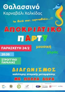 Την Παρασκευή 24 Φεβρουαρίου, σιτς 20.30 το βράδυ, διασκεδάζουμε στο αποκριάτικο πάρτι στο στρογγυλό της παραλίας Χαλκίδας, με χορό, τραγούδι και πλούσια δώρα για την καλύτερη ατομική μεταμφίεση!!!