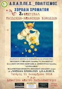 Το 2ο Φεστιβάλ Παιδικών – Νεανικών Χορωδιών θα πραγματοποιηθεί την Τετάρτη 21 Δεκεμβρίου 2016 και ώρα 19.00 στο Θέατρο Παπαδημητρίου. Είσοδος ελεύθερη. Συμμετέχουν οι χορωδίες – ορχήστρες: Μουσικού Γυμνασίου Χαλκίδας «Ν.Σκαλκώτας», Καλλιτεχνικού Εργαστηρίου Έκφρασης και Δημιουργίας Χαλκίδας «Αστρολάβος», Φιλαρμονική Ορχήστρα Μουσικού Σχολείου Αλίμου και η Χορωδία Χρωμάτων του ΔΟΑΠΠΕΧ. Χορηγοί εκδήλωση: Ζαχαροπλαστείο Βασιλείου, Φούρνος Λεμπέση, […]