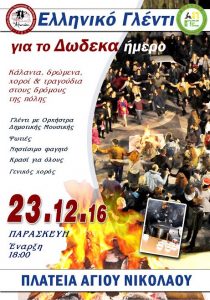 Ελληνικό γλέντι για το Δωδεκαήμερο πραγματοποιεί ο Σύλλογος «Τ’ Αλωνάκι», την Παρασκευή 23 Δεκεμβρίου 2016 και ώρα 18.00, στην πλατεία του Αγίου Νικολάου, με την υποστήριξη του ΔΟΑΠΠΕΧ. Κάλαντα, δρώμενα, χοροί και τραγούδια στους δρόμους της πόλης. Γλέντι με Ορχήστρα Δημοτικής Μουσικής, φωτιά, νηστίσιμο φαγητό και κρασί για όλους, μας περιμένουν να γιορτάσουμε όλοι μαζί […]