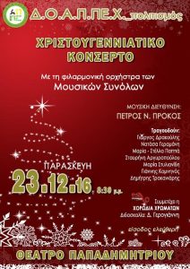 Το καθιερωμένο Χριστουγεννιάτικο Κονσέρτο πραγματοποιεί η Φιλαρμονική Ορχήστρα των Μουσικών Συνόλων του ΔΟΑΠΠΕΧ, την Παρασκευή 23 Δεκεμβρίου 2016 και ώρα 20.30, στο Θέατρο Παπαδημητρίου. Είσοδος ελεύθερη. Μουσική Διεύθυνση: Πέτρος Ν. Πρόκος Τραγουδούν: Γιώργος Δρακούλης, Νατάσα Γεραμάνη, Μαρία – Στέλλα Παππά, Σταυρήνη Αργυροπούλου, Μαρία Στυλιανίδη, Γιάννης Κομνηνός, Δημήτρης Τρακανιάρης. Συμμετέχει η Χορωδία Χρωμάτων – Διδασκαλία, Δέσποινα […]