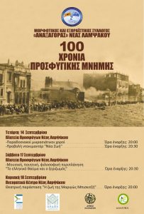 Ο Μορφωτικός, Εξωραϊστικός Σύλλογος Αναξαγόρας” Ν. Λαμψάκου, σε συνεργασία με το ΔΟΑΠΠΕΧ, διοργανώνουν 3ήμερο εκδηλώσεων με τίτλο «100 Χρόνια Προσφυγικής Μνήμης», που θα πραγματοποιηθούν στις 14, 17 & 18 Σεπτεμβρίου, στη Ν. Λάμψακο, στην πλατεία προσφύγων. Τετάρτη 14 Σεπτεμβρίου Ώρα 11:00 Επιμνημόσυνη δέηση και κατάθεση στεφάνων Ώρα 20:00 Παραδοσιακοί Μικρασιάτικοι χοροί Ώρα 20:30 Προβολή Ντοκιμαντέρ […]
