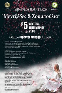 “Μενεξέδες & Ζουμπούλια”. Η ζωή της γυναίκας μέσα στην ιστορία. Μια θεατρική παράσταση σε κείμενα και επιμέλεια του Λευτέρη Πνευματικού, που πραγματεύεται τις ιστορίες τεσσάρων γυναικών μέσα στο χρόνο. Η ζωή μίας Σμυρνιάς πριν και μετά την καταστροφή. Η ζωή μίας γυναίκας στα απαγορευμένα κουτούκια του Πειραιά. Η ζωή μίας αγρότισσας στους κάμπους της Θεσσαλίας […]