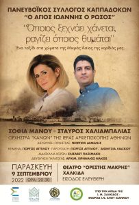 Ο Πανευβοϊκός Σύλλογος Καππαδοκών ‘Άγιος Ιωάννης ο Ρώσος”, σε συνεργασία με τον ΔΟΑΠΠΕΧ, στο πλαίσιο του έτους για τα «100 Χρόνια Εθνικής Μνήμης», διοργανώνουν την εκδήλωση με τίτλο: “Όποιος ξεχνάει χάνεται, ραγίζει όποιος θυμάται”, που θα πραγματοποιηθεί την Παρασκευή 9 Σεπτεμβρίου και ώρα 20:30, στο Δημοτικό Θέατρο «Ορέστης Μακρής», με είσοδο ελεύθερη για το κοινό. […]