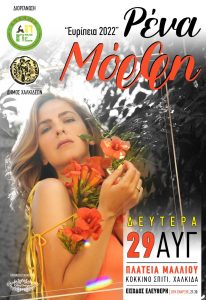 Στα πλαίσια του πολιτιστικού προγράμματος «ΕΥΡΙΠΕΙΑ 2022», που διοργανώνει ο Οργανισμός Πολιτισμού του Δήμου Χαλκιδέων (Δ.Ο.Α.Π.ΠΕ.Χ.), σας γνωρίζουμε ότι θα πραγματοποιηθεί συναυλία με τη «ΡΕΝΑ ΜΟΡΦΗ» (Διοργάνωση Δ.Ο.Α.Π.ΠΕ.Χ.) την Δευτέρα 29 Αυγούστου 2022 στις 9:30 μ.μ. στην Πλατεία Μάλλιου (Κόκκινο Σπίτι) αντί για το Δημοτικό Θέατρο «Ορέστη Μακρή», όπως αρχικά είχε ανακοινωθεί.Μετά τις sold out […]