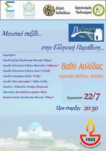 Στο πλαίσιο των εκδηλώσεων για τα «100 χρόνια Εθνικής Μνήμης» από τη Μικρασιατική καταστροφή, που διοργανώνουν ο Δήμος Χαλκιδέων και ο Πολιτιστικός Οργανισμός (ΔΟΑΠΠΕΧ), αύριο Παρασκευή 22 Ιουλίου και ώρα 20:30, στο λιμανάκι της παραλίας του Βαθέος Αυλίδας, θα πραγματοποιηθεί συναυλία με τίτλο: «Μουσικό Ταξίδι στην Ελληνική Παράδοση». Συμμετέχουν οι Χορωδίες: Σχολής Παραδοσιακής μουσικής «Γέφυρες», […]
